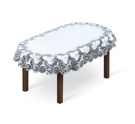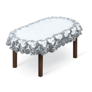 Owalny żakardowy obrus w kolorze biało-szarym nada szyku i elegancji oraz ozdobi każde pomieszczenie.